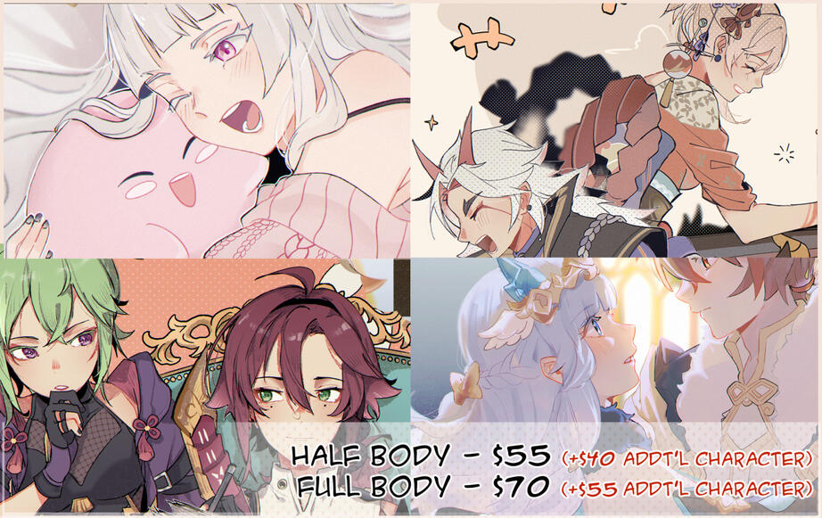 » I accept payment upfront via Paypal or Ko-fi, USD only.» Paypal: I'll send an invoice to you with the following information.» Ko-fi: I'll send my ko-fi account which you can use as a means of transaction.» Please pay full upfront if you want to reserve a slot.